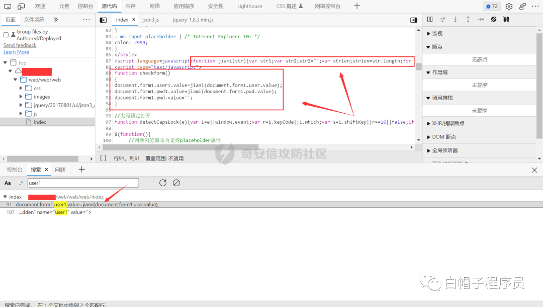 之前学过一点JS逆向,Ctrl + Shift + F,搜索被加密的参数 - user1,找到了加密函数(呜呜这个逆向好简单,丝毫没有展示出我的逆向技术)