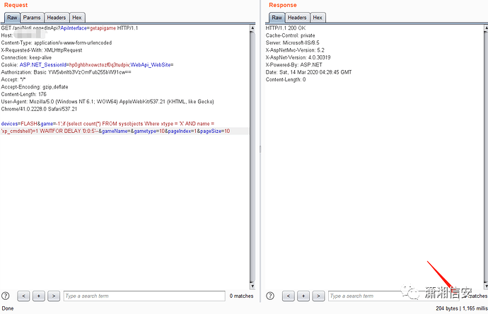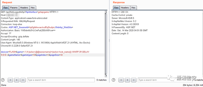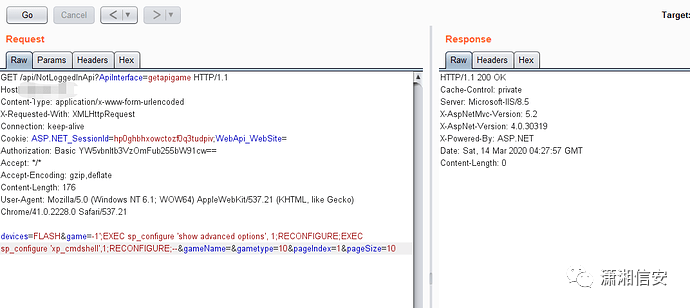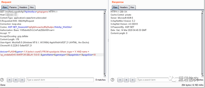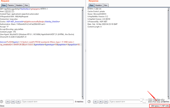 不甘心,于是来到burp,如果xp_cmdshell启用返回时间应该是>=5,然儿只有1秒多钟,证明没有开启成功。