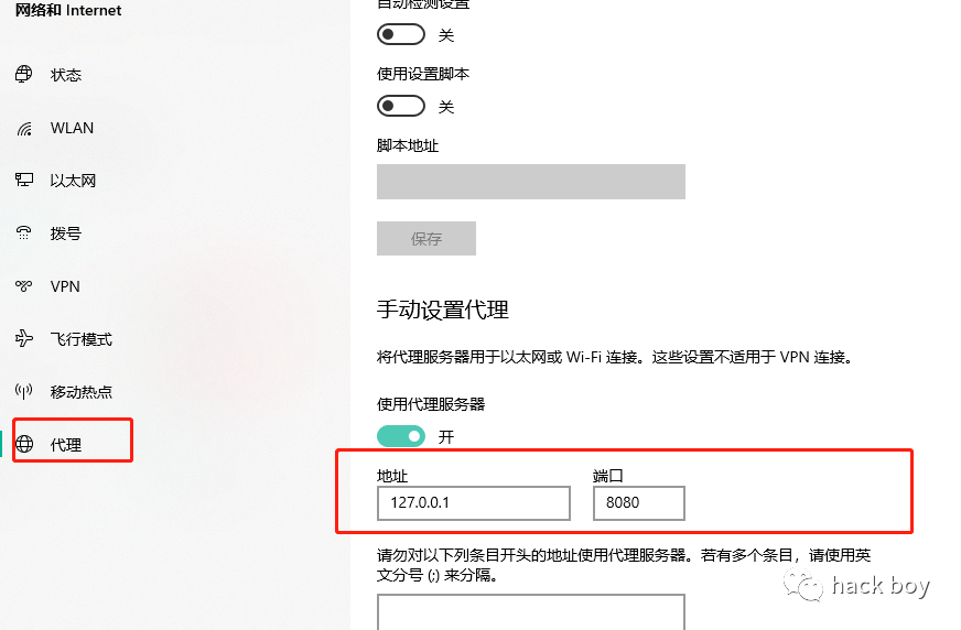 windows直接设置--》网络和Internet,找到代理,打开设置为bp的端口即可。