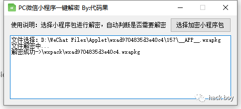 第五步:解密后会在同目录的wxpack下生成一个新的wxapkg,这是使用反编译的工具对其进行反编译即可。会生成一个目录,其中就是一些反编译的js文件等。