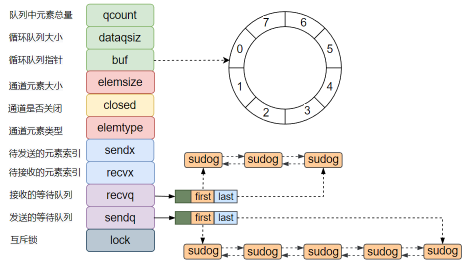 buf 是指向循环队列的指针,循环队列是大小固定的用来存放chan接收的数据的队列;
