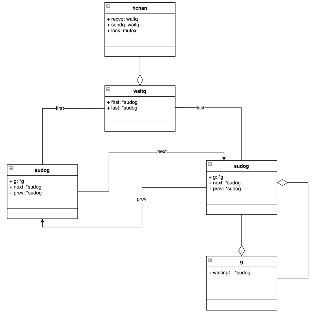 sudog代表着等待队列中的一个goroutine,G与同步对象(指chan)关系是多对多的。一个 G 可以出现在许多等待队列上,因此一个 G 可能有多个sudog。并且多个 G 可能正在等待同一个同步对象,因此一个对象可能有许多 sudog。sudog 是从特殊池中分配出来的。使用 acquireSudog 和 releaseSudog 分配和释放它们。