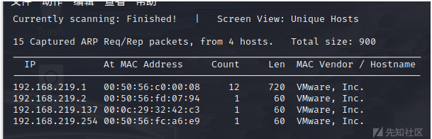 使用netdiscover扫描(arp扫描工具,既可以主动扫描也可以被动嗅探)