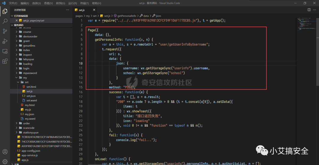 举例某小程序审计,在登录界面爆破无关之后,直接反编译拖源码审计一下,反编译出来的源码,我们着重看 js 文件及其配置文件即可。第一想法就是先找一些接口,尝试是否有未授权之类的漏洞,下面就是找到的一处路由user/getUserInfoByUsername
