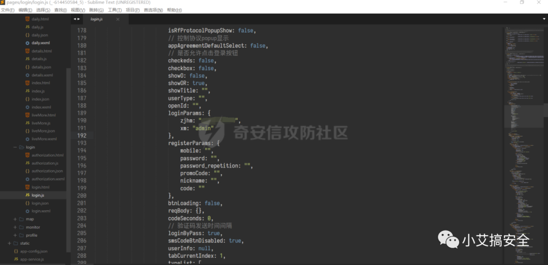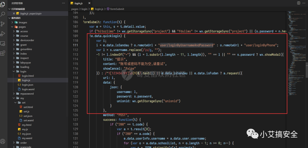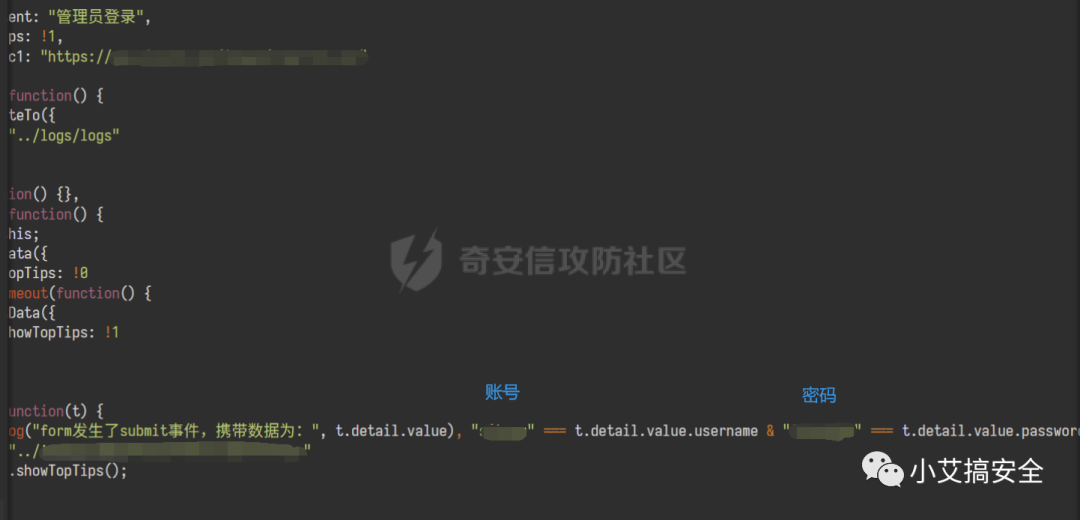 反编译出来的源码泄露登录账号密码,这里是因为在 js 文件中写死了账号密码,只做了前端验证导致的漏洞,从下面贴的两个小程序源码中可以看到