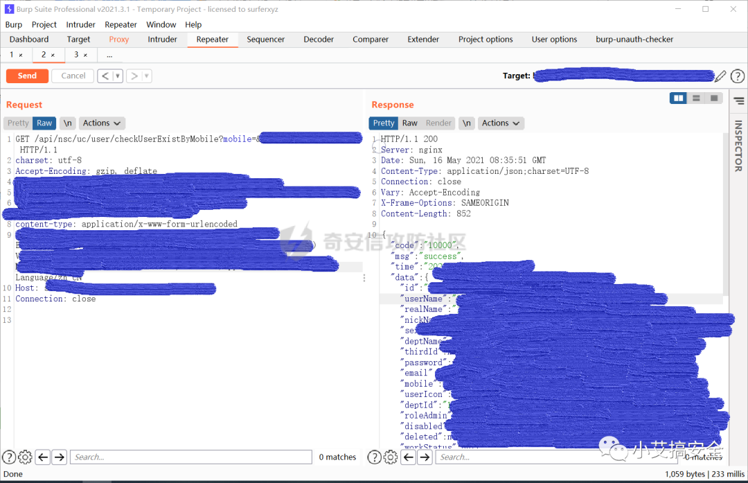 除此之外,测试一些参数,比如手机号,不知道该系统用户手机号时,可以试试像上面说的将其置空,往往运气好能碰上系统后端查询使用的模糊查询为空时返回所有信息,下面贴图的案例就是将手机号参数置空后,成功获取到账号详细信息