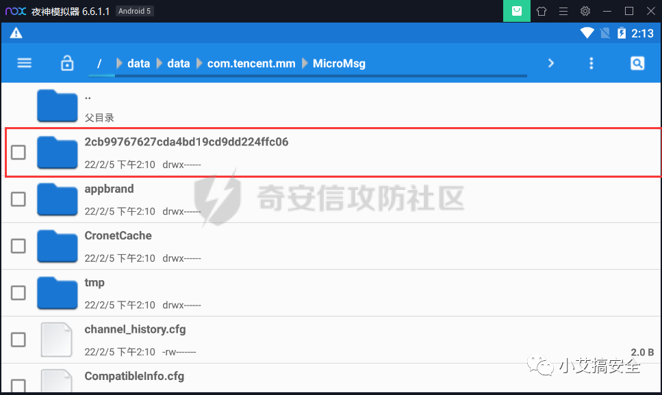 打开文件管理器,在data/data/com.tencent.mm/MicroMsg会生成一个md5加密命名的文件夹(如果打开微信小程序过多,同时有多个文件夹不容易识别的情况,可以选择把MicroMsg文件夹所有内容删除掉,再去重新打开微信小程序,就会得到唯一一个MD5加密命名的文件夹啦)