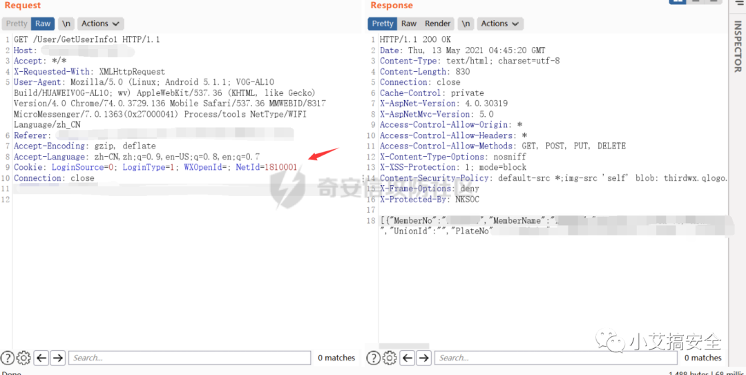 下面案例举例一个通过 Cookie 中的参数进行鉴权的漏洞,可以通过修改NetId中的值来遍历获取用户信息。此类漏洞的挖掘在鉴权处的源码,审计时可以着重审计其验证流程