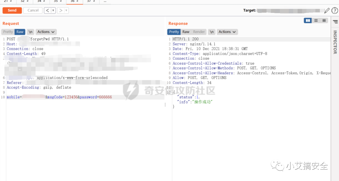 还有 任意密码重置 ,该处漏洞倒也是在黑盒中无意发现,在修改密码处需要验证对应账号接收到的短信验证码。但怀着尝试的心态通过 buspsuite 抓包绕过 js 限制,随意填写验证码便可以重置任意用户密码,不细心就会很容易忽视的点