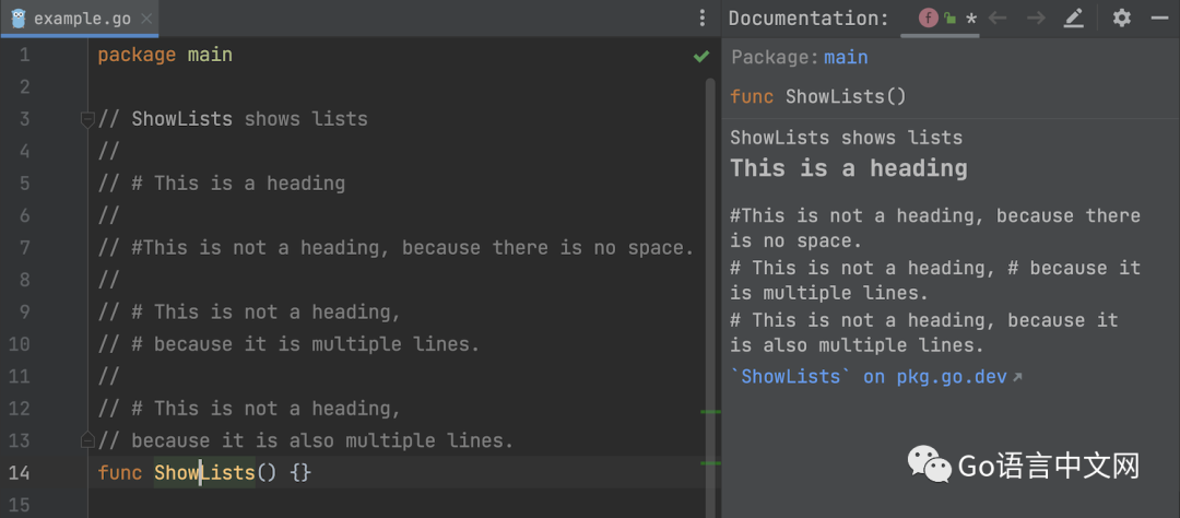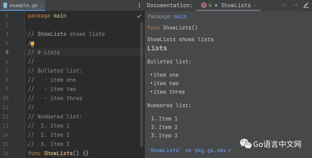 Go 1.19 在文档注释中添加了对链接、列表和新标题的支持。GoLand 2022.3 也支持这些新功能。