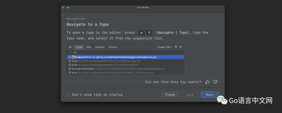 我们增强了 Tips of the Day(每日小技巧)功能,这是一种帮助你探索 GoLand 的学习工具。