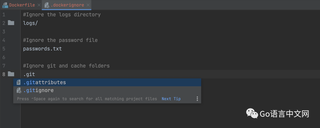 .dockerignore 文件类型支持我们引入了对 .dockerignore 文件的全面支持,包括代码高亮显示和补全。从 IDE 构建镜像时,这些文件会被纳入考量。