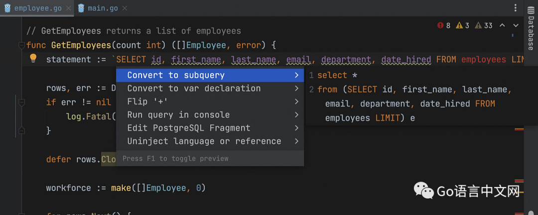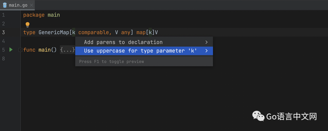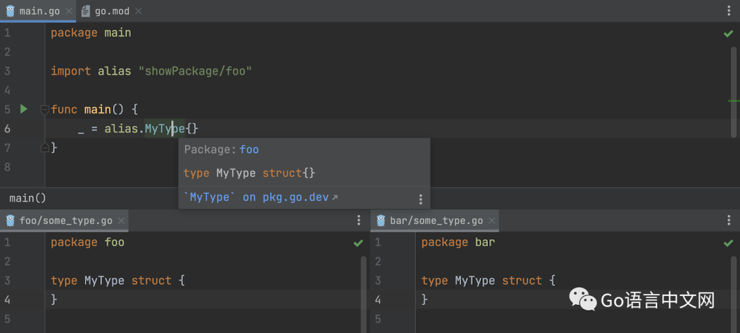 IDE 现在始终在顶层声明的 Quick documentation(快速文档)弹出窗口中显示软件包名称。此前,只有在找到 doc.go 或 <pkg_name>.go 文件时才会显示软件包头。