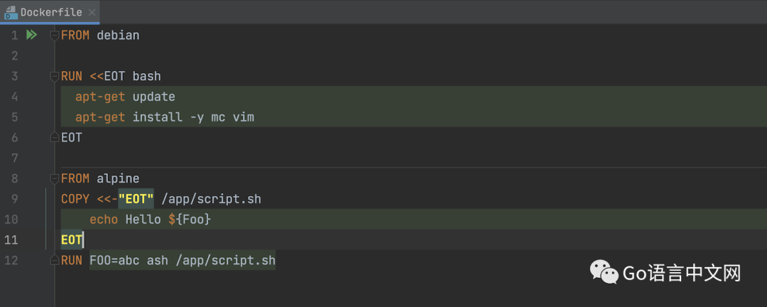 Here 文档允许将后续 Dockerfile 行重定向到 RUN 或 COPY 命令的输入。GoLand 现在支持此语法,你可以使用它在 Dockerfile 文件中生成配置文件或多行脚本。