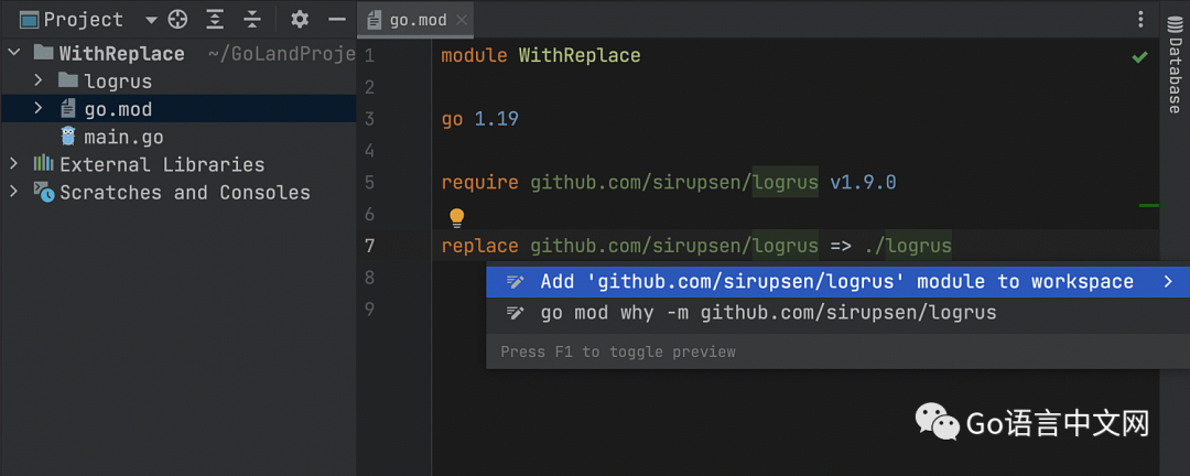 replace 指令生成 go.work如果有 replace 指令,你现在可以从 go.mod 生成 go.work。将文本光标置于 replace 指令上,按 ⌥⏎ 查看所有可用意图操作,然后选择 Add … module to workspace…(将 … 模块添加到工作区)快速修复。
