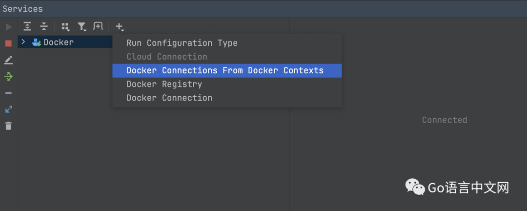 如果 Docker 配置中已有这些设置,你现在可以使用 Docker 上下文设置额外的 Docker 连接。为此,你可以在 Services(服务)视图中调用 Add Service(添加服务)上下文菜单并选择 Docker Connections From Docker Contexts(来自 Docker 上下文的 Docker 连接)。