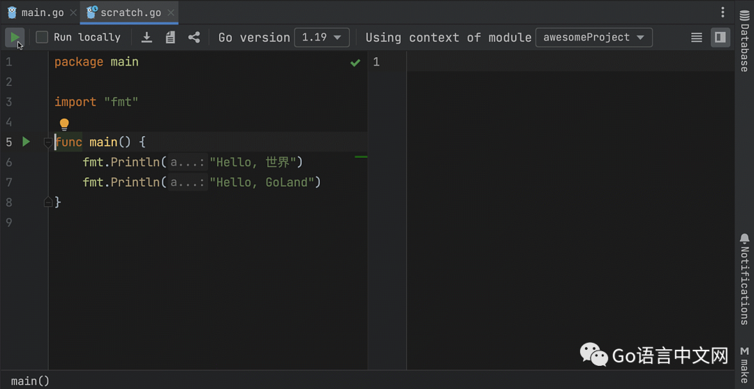 可以格式化和共享你的代码、更改 Go 版本、使用 Go Playground 服务器运行代码,或在本地运行。