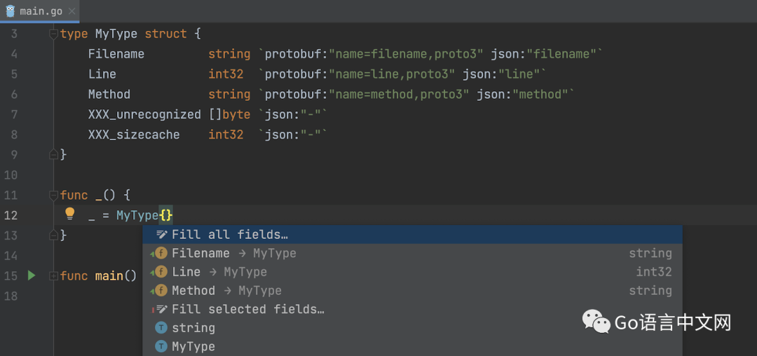 调用 Fill all fields(填充所有字段)意图操作时,IDE 会忽略以 XXX_ 开头的自动生成的协议缓冲区字段。这些字段仅在第二次调用补全后显示。
