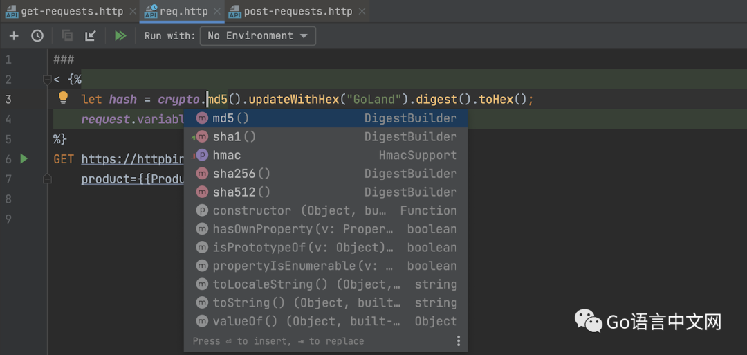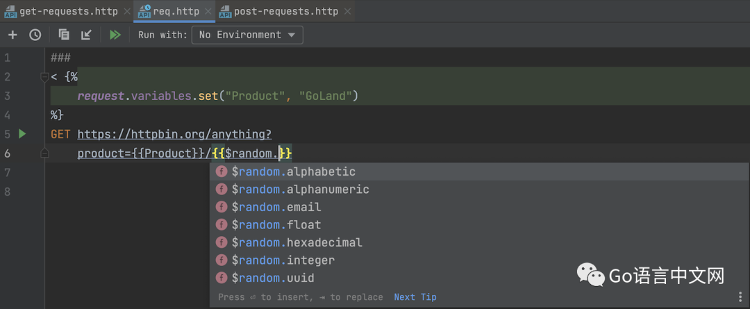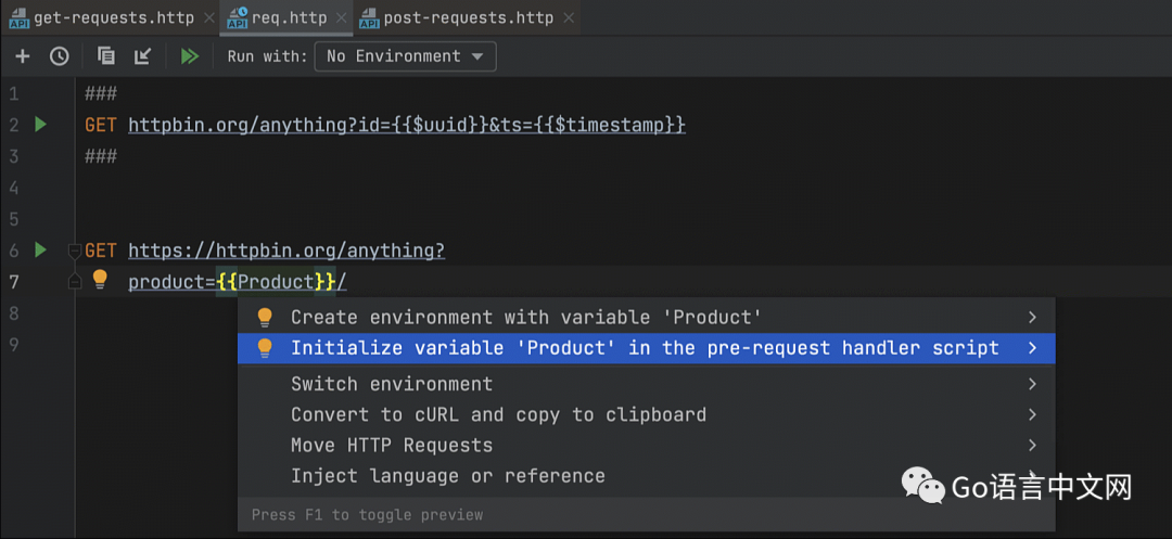 HTTP 客户端现在支持在请求之前执行脚本块。你可以在执行请求之前生成数据,并使用变量将其放入最终请求。可以使用快速修复创建用于初始化变量的样板代码。