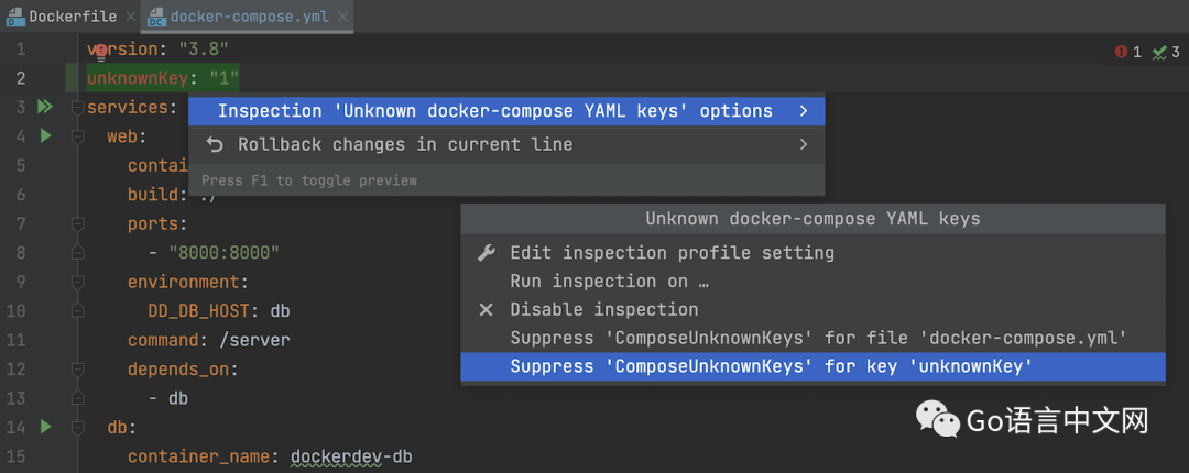 在 YAML 文件(包括 Kubernetes 文件、OpenAPI 规范和 docker-compose.yml 文件)中,新增的快速修复可以通过注释禁止检查。