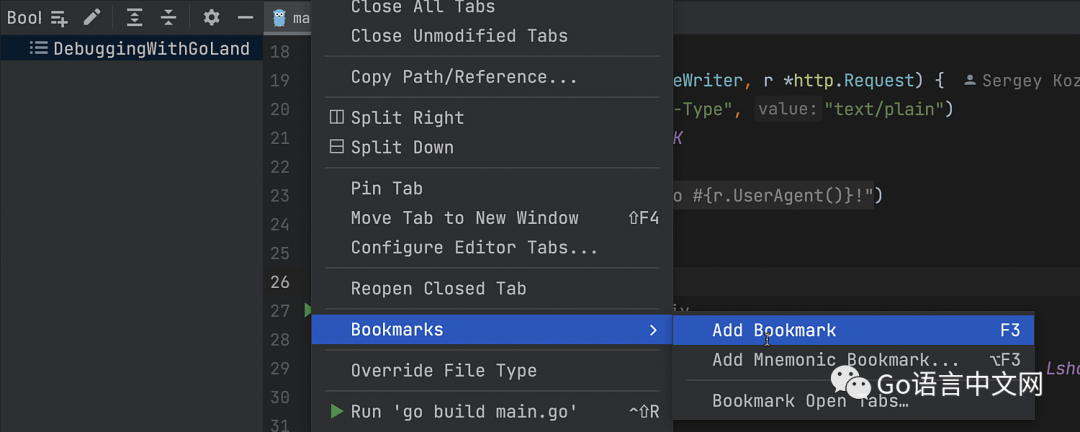 现在,又可以从编辑器选项卡中为文件添加书签了。只需右键点击选项卡调用上下文菜单并选择 Bookmarks(书签)。