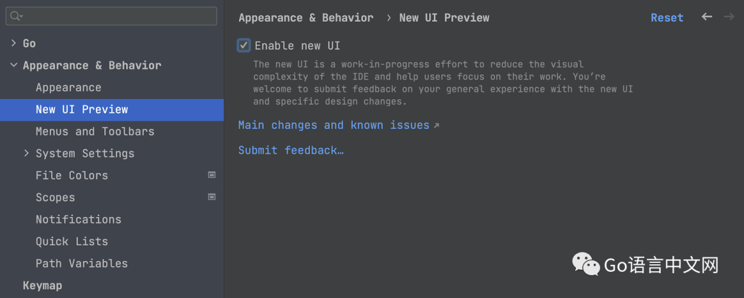 我们邀请你在 Preferences | Appearance & Behavior | New UI Preview(设置 | 外观与行为 | 新 UI 预览)中切换到新 UI。