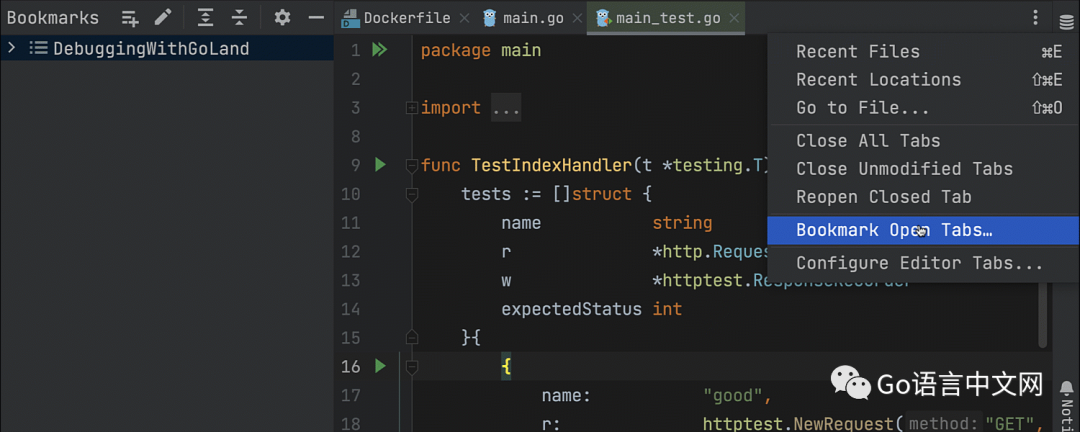 你可以将当前打开的所有选项卡中的所有文件添加到 Bookmarks(书签)。为此,可以调用相同上下文菜单并选择 Bookmark Open Tabs(为打开的选项卡添加书签),也可以使用编辑器选项卡窗格右侧的三点图标调用此操作。