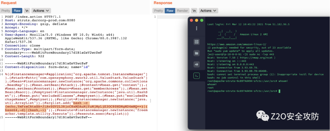攻击者发现我们使用的Apache Struts2版本存在CVE-2020-17530的漏洞,该漏洞允许在机器上执行远程代码。如果攻击者成功地利用了这个漏洞,他们将能够在机器上执行任意代码,包括获得一个反弹shell。