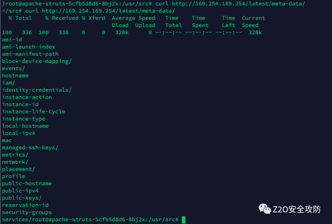 从主机名,apache-struts-6c8974d494,攻击者可以看到他们落在了Kubernetes集群内的一个pod或容器中。