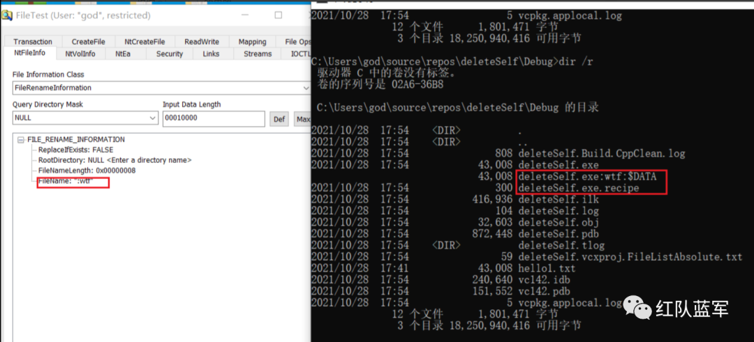 2.重新打开文件,设置FileDispositionInfo文件属性delete为true,这样关闭文件句柄的时候就会自动删除该文件。