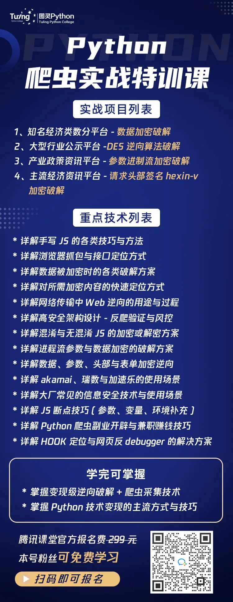 这是一套专讲爬虫与反爬虫攻防的实战课程,迄今为止已经帮助了超3W学员快速进阶!本次课程将由国际大数据竞赛获奖大佬亲身指导,带领大家进行一线前沿技术体系+多重逆向解析项目实战的综合技术速成训练!