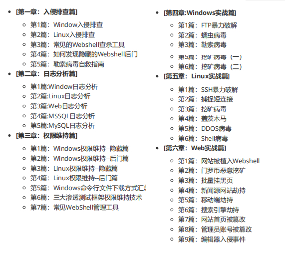 为此,给大家分享一份应急响应实战笔记,共168页6大章,包括入侵排查、日志分析、权限维持、实战等内容,图文并茂,内容详尽,非常适合安全人/爱好者学习参考。