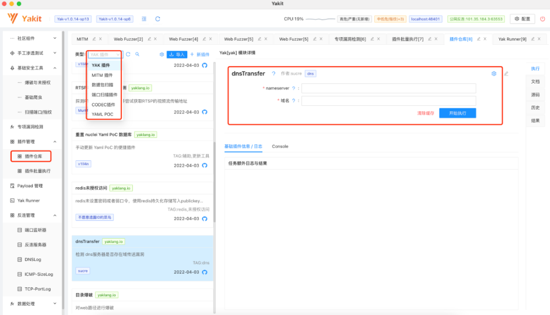 为了快速提升poc的检测能力,我们在yak语言中原生集成了nuclei(MIT协议),当然,在插件模块中,你可以基于yak/yaml编写各种你想要的检测能力,并将插件快速展示到左侧菜单栏中。快来跟我们一起完善Yakit插件吧