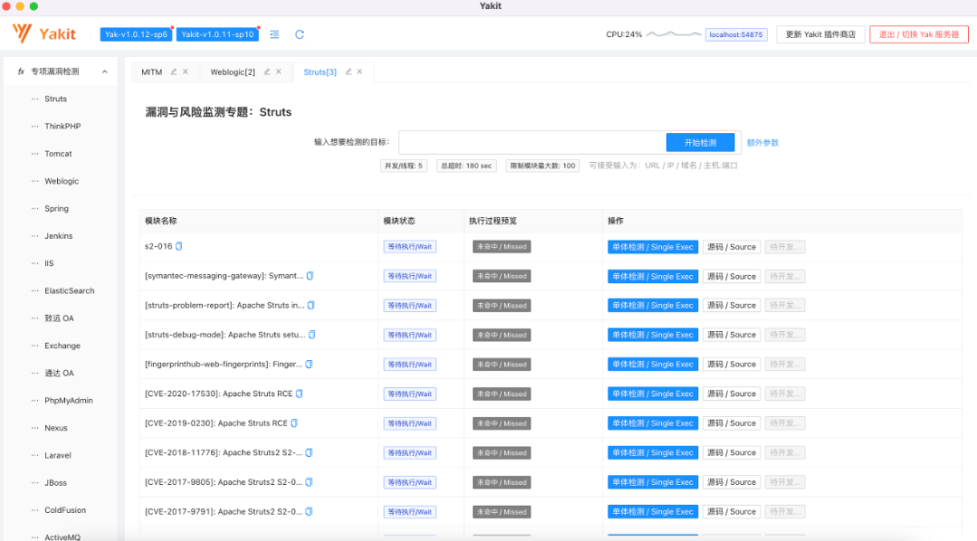 在实战安全测试过程中,我们经常面临一个需求,即已知对方使用了weblogic/struts2等,需要一键检测是否存在指定漏洞,然而这么简单的需求我们当下却要打开各种专用工具不停切换,甚至为了安装某个工具而不得不切换Windows/Linux,或者安装一堆复杂的依赖。在yakit上,我们将致力于提供一站式的解决方案,您只需要输入目标,点击开始检测按钮,即可快速得到结果。