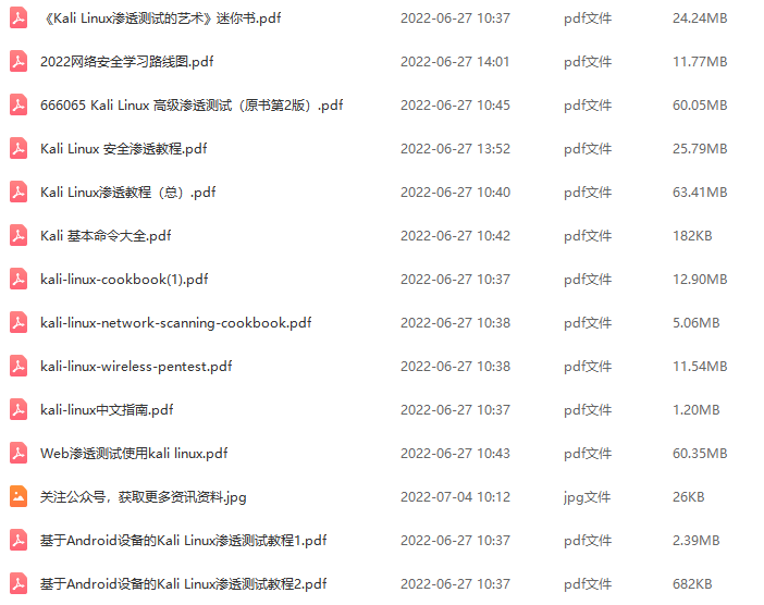 作为一名从事渗透测试的人员,不懂Kali Linux的话,就out了。它预装了数百种享誉盛名的渗透工具,使你可以更轻松地测试、破解以及进行与数字取证相关的任何其他工作。今天给大家分享一套Kali Linux资料合集,包括12份Kali Linux渗透测试PDF资料,内容全面丰富,特别适合渗透测试初学者、想入行安全的朋友学习参考,建议大家人手一份。