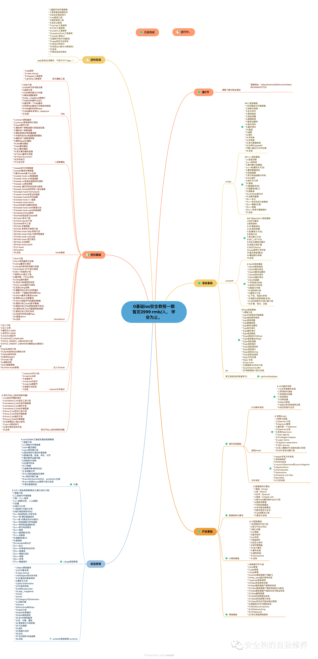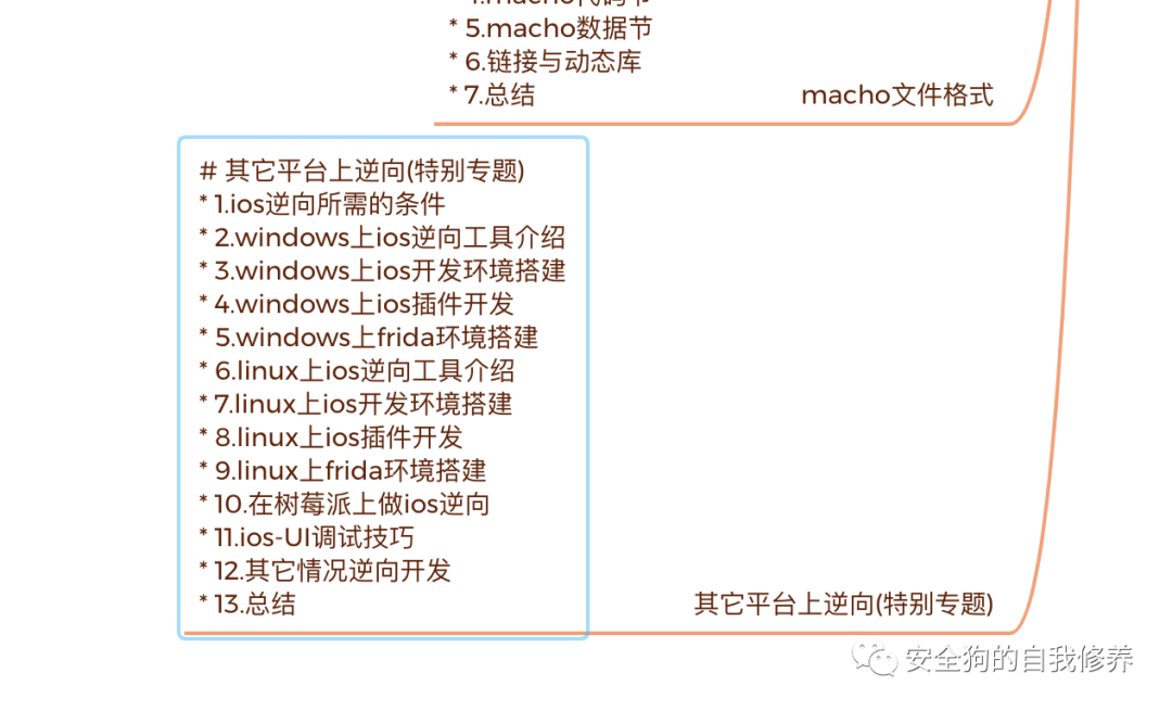 # ios逆向视频教程第一期## 第0章* 0.课程了解与职业规划## c语言基础* 1.历史概述与环境搭建* 2.进制与转换* 3.位与符号* 4.程序结构* 5.语言变量* 6.数据类型* 7.数学运算符* 8.条件语句* 9.循环语句* 10.数组* 11.函数* 12.指针* 13.字符串* 14.作用域* 15.其它数据类型* 16.枚举与typedef* 17.输入输出与文件处理* 18.总结*## c++语言基础* 1.c语言回顾* 2.c++结构体* 3.面对象与类基础* 4.c++类(属性与方法)* 5.静态数据成员* 6.构造函数* 7.其它构造函数与时机* 8.this指针* 9.指针与引用* 10.继承* 11.虚函数(多态)* 12.抽象类(接口)* 13.虚继承* 14.Lambda表达式* 15.运算符重载* 16.c++友元* 17.c++命名空间与嵌套类* 18.c++模板(泛型)* 19.c++容器* 20.c++异常与智能指针* 21.总结## Objective-C语言基础1.历史与概述2.程序结构3.OC基础语法4.OC类的构建5.类(属性与方法)6.构造方法7.其它默认方法8.SET_GET方法9.多态与属性关键字10.类别与类扩展11.协议与block12.cpp使用与字符串13.复合类型(集合)14.懒加载与单例15.总结# Swift语言基础* 1.Swift程序结构* 2.Swift基本语法* 3.Swift数学运算符* 4.Swift条件语句* 5.Swift循环语句* 6.Swift函数* 7.作用域与闭包* 8.枚举与字符串* 9.数组与字典* 10.结构体与类* 11.属性与方法* 12.下标、构造与析构* 13.继承与类型转换(多态)* 14.访问控制与引用计数介绍* 15.扩展、协议、泛型## go语言基础* 1.课程介绍* 2.go开发调试环境搭建* 3.go语言程序结构* 4.go语言变量* 5.go数据类型* 6.go数学运算符* 7.go条件语句* 8.go循环语句* 9.go语言数组* 10.go语言切片(Slice)* 11.go语言集合(Map)* 12.go语言函数* 13.go语言指针* 14.go语言结构体* 15.go语言接口* 16.go语言String* 17.go语言包结构* 18.go文件处理* 19.go-并发* 20.go-Json* 21.数据库与ORM介绍* 22.protocol buffer* 23.网络通信介绍与总结## 补充其它语言了解## 认识操作系统* 1.认识苹果操作系统* 2.常用软件准备* 3.系统版本发展* 4.系统架构* 5.内核发展* 6.Mach原语* 7.动态分析系统调用过程* 8.安全机制与生态# 守护进程与服务* 1.进程与线程* 2.Daemon介绍* 3.Daemon管理* 4.编写第一个Daemon* 5.Daemon分类* 6.系统Daemons* 7.User agents* 8.Privileged helpers* 9.Login items* 10.System extensions* 11.XPC service* 12.深入理解XPC消息传递(C实现)* 13.XPC安全问题介绍## 文件系统* 1.Apple专有文件系统* 2.系统卷保护* 3.POSIX目录* 4.LaunchDaemons和LaunchAgents* 5.Applications* 6.Frameworks* 7.Extensions* 8.Property List files* 9.Bundles* 10.日志系统# 数据结构与算法* 1.数组(Array)* 2.栈(Stack)* 3.队列(Queue)* 4.链表(Linked List)* 5.树(Tree)散列表(Hash)介绍* 6.密码学原理* 7.对称加密算法* 8.非对称加密算法* 9.数字签名与证书* 10.业务算法介绍* 11.算法与总结# UI框架基础* 1.应用程序开发介绍* 2.其它平台UI对比* 3.窗口对象* 4.UI视图* 5.基本控件* 6.UI布局* 7.高级控件* 8.自定义控件* 9.控件管理器* 10.设计模式* 11.事件处理* 12.通知机制* 13.framework* 14.总结# 网络基础* 1.网络基础介绍* 2.抓包与pcap文件格式介绍* 3.以太网头与ip头结构* 4.tcp原理与包结构* 5.udp原理与包结构* 6.http原理与包结构* 7.socket服务器客户端复习* 8.http_post提交简单实现* 9.openssl简单使用* 10.https实现请求百度* 11.https服务器客户端简单实现* 12.https服务器客户端实现添加CA验证* 13.https服务器客户端双向证书验证实现* 14.解密思路与抓包原理介绍* 15.协议分析实战介绍* 16.数据包中证书提取实现* 17.其它常用框架与总结公众号:安全狗的自我修养