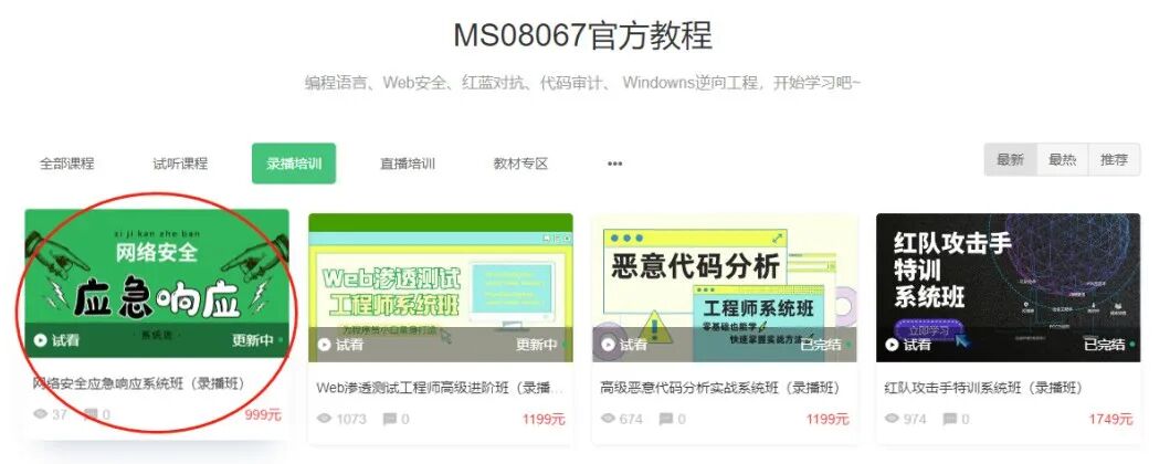为此,MS08067安全实验室特别推出网络安全应急响应系统班,共12节课,包括应急响应介绍、数据库日志分析、常用工具介绍、入侵事件、实战等内容,专业老师视频讲解,内容详尽,非常适合安全人/爱好者学习参考。
