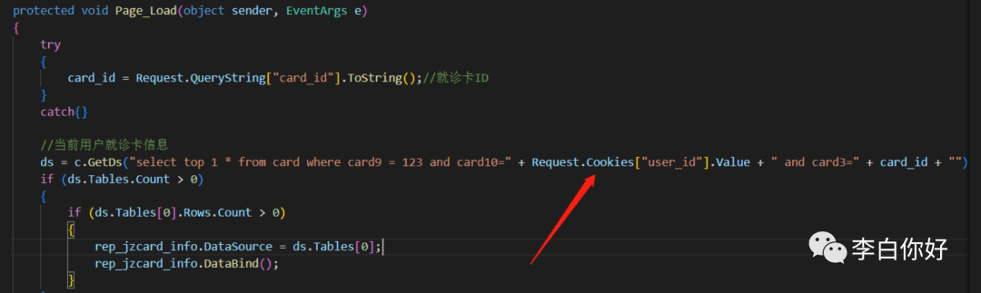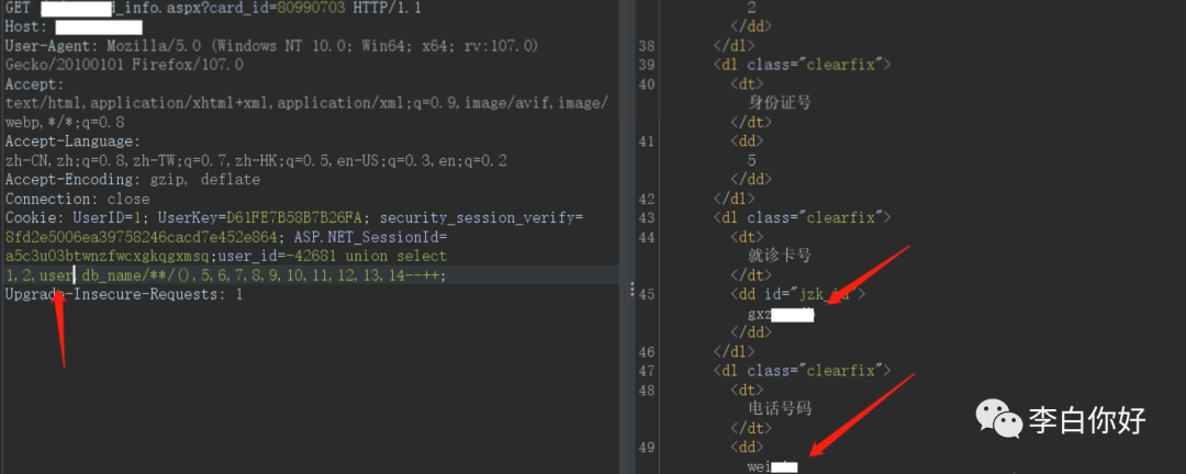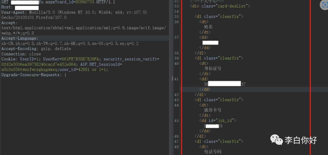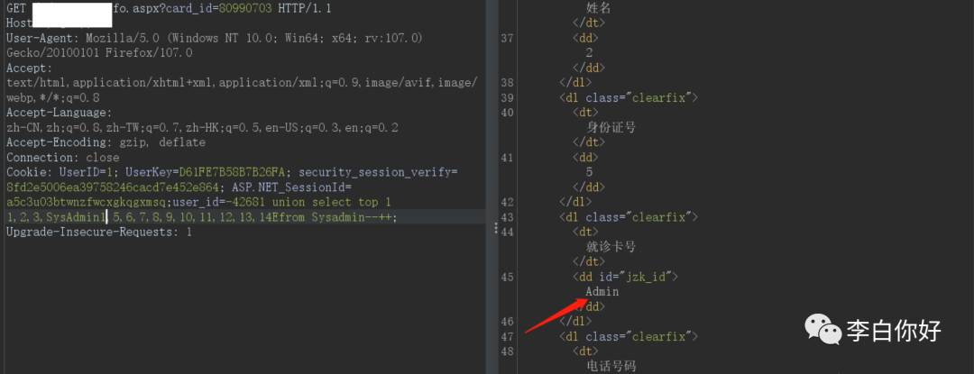 虽然拿到了管理员账号密码,但是无法解密。无法拿到后台权限,但是却可以通过sql注入拿到大量数据,从而得分。此处SQL语句会查询用户的就诊卡信息,就诊卡信息中包括病人姓名,身份证,电话,就诊卡号等敏感信息,令user_id=42681 or 1=1,去遍历42681这个数值,如果存在用户就诊卡信息则会显示对应用户信息,如果不存在则会显示电话为130xxxxxxx的用户信息