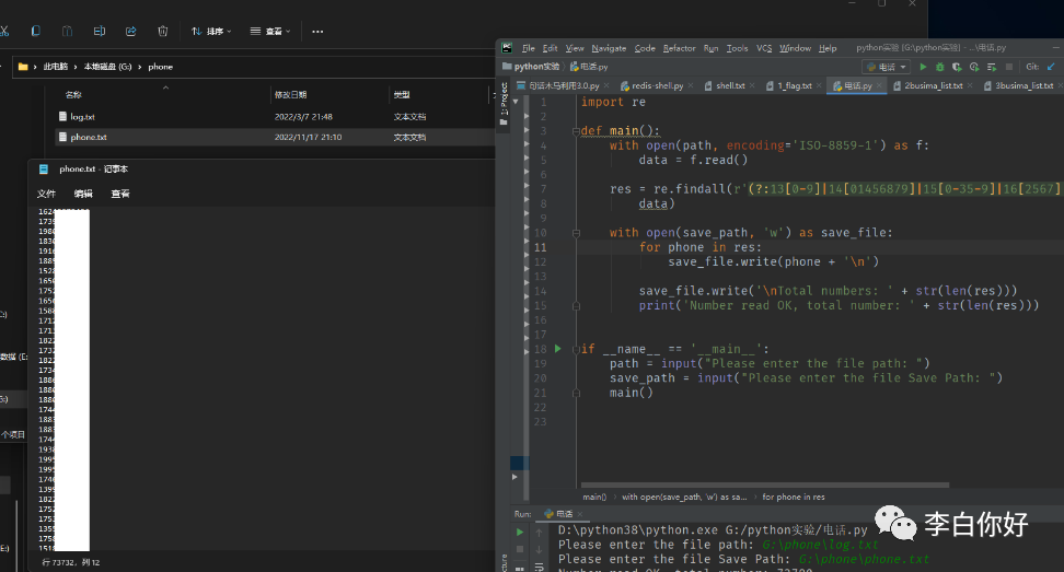 泄露数据类型包括姓名,电话,个人病例信息。但是log日志文件太大了,怎样证明其中的数据量呢。可以通过一个python脚本对日志中的电话号码进行提取,根据其结果得出数据量多少,然后嘎嘎拿分