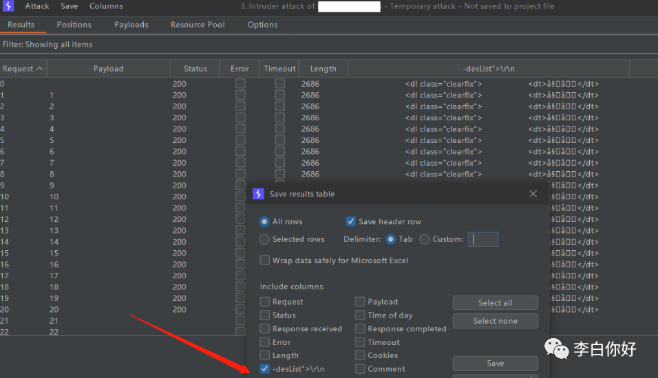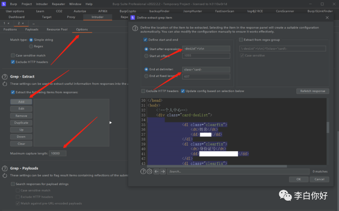 实际上burp有对应的功能,将其发送到intruder模块,选择好参数爆破。之后在options选项的Grep-Extract功能下,对其想要提取的数据进行匹配,注意箭头所指的Start after expression和End at delimiten在整个响应包中没有重复的部分,除此之外还要设置可以匹配响应包的长度,因为默认是100,自然是不够的。我这里改成了10000