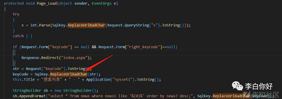 所以此时有两种思路,第一种就是找调用了ReplaceUrlBadChar函数的数字型注入,第二种则是直接找没有调用ReplaceUrlBadChar函数的参数。