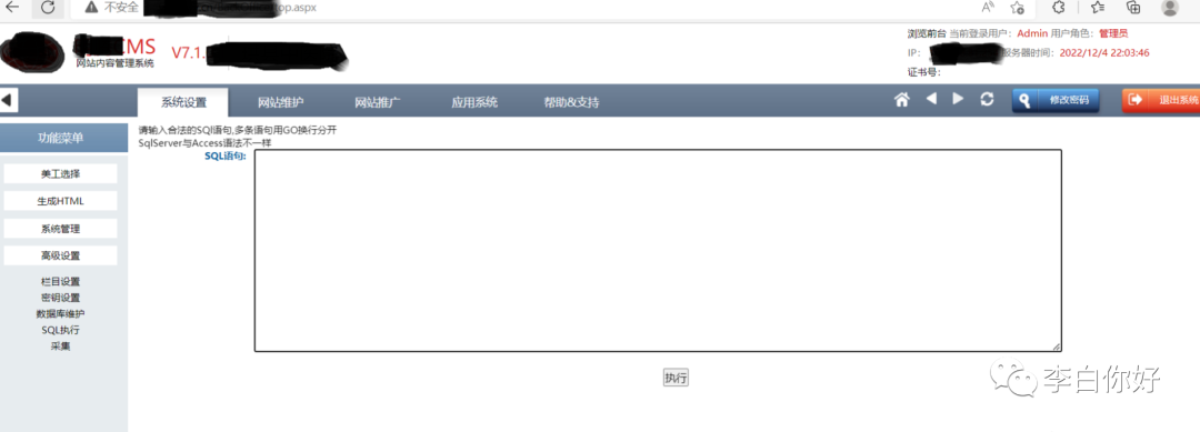 那么究竟要怎么办呢,想了下,既然无法执行xp_cmdshell,但是我可以通过执行插入语句新增管理员来进入后台,再利用后台的执行sql语句功能来getshell