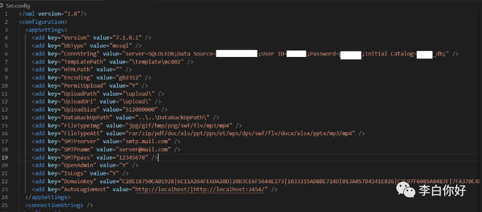 在下载完源码文件之后,首先肯定是要先看下配置文件。在配置文件中,可以看到此时连接mssql用的是内网ip地址,导致了不能直接外连。除此之外还需要特别注意的是数据库密码是(目标网站系统名的缩写+_1),比如说网站名是先知社区,而这数据库密码设置成了xzsq_1。后期的话可以利用此关键字进行字典的生成
