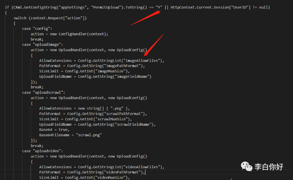 可以看到这里实际上是有鉴权处理逻辑的,并且这里的文件上传代码是白名单,上传的后缀内容都是由配置文件中写好了