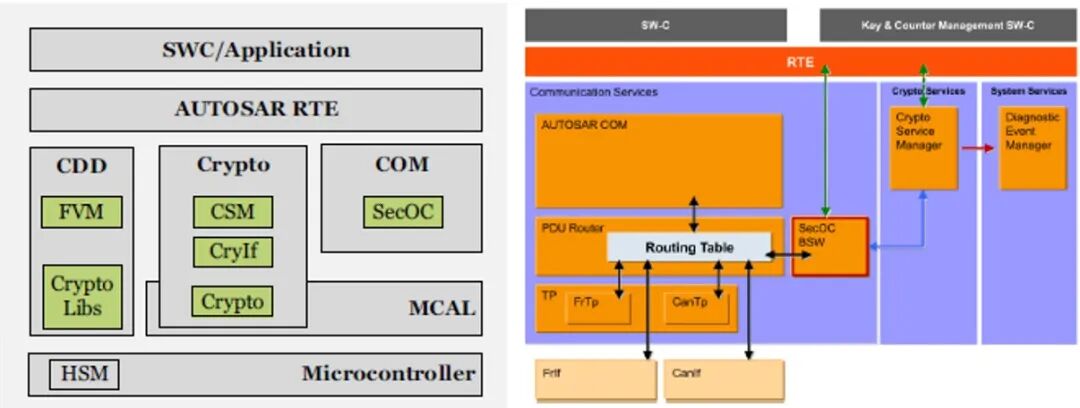 一些入侵行为需要去收集车上所有ECU的一些报文,无论是CLAN还是以太网,这些都是你去判断是否有入侵行为的一个数据源头,所以你要从域控制器上把一些数据包给收集过来上面,但不能把所有包直接全部传过来,需要有一定规则的,有IDPS的话,有一些slave的谋害会按一定的规则去一些数据的异常行为,然后更新给中央网关,中央网关再去统一去做筛选和规则匹配。对于试验报告,一般这个系统部署在云端,它的上面可以算力比较强,它可以去上面运行一些安全机制,策略管理,它可以做很多对于IDPS的一些规则判断或者是对于整个车辆平台和车型做一个进步的IDPS的这样一个规则的升级。它可以获得这些漏洞。最新的漏洞和攻击手段,它都可以在这个系统上去识别,然后再匹配车上反应出来的一些数据,做一个规则匹配。对于车载IDPS,大概就是这样一个系统设计。今天我们讲AUTOSAR里面信息安全架构有哪些?前面也提到了一些概念,就是实际上就是AUTOSAR里面就在使用的。像Crypto Stack提供一些软件加密和密码服务,这是一个基本的模块和CSM 提供可信软件的模块链路。还有就是一些通信的安全协议像SecOC 、TLS、IPsec每个层级都有一些安全的协议。还有就是AP里面的IDS专门是用来做一个权限的管理,对于本地的资源做访问,做统一的安全诊断,安全诊断除了UDS里面的R7服务,现在多了一个R9,专门用来做一些信息安全产品的验证,对UDS做了一个这方面的扩展。下图左边是AUTOSAR里面跟信息安全有关的一些组件模块,主要Crypto Driver、Crypto Interface以及CSM模块。右边是AP下面和信息安全有关的。AP那边不能直接说这几个模块是信息安全有关的,应该说它是哪些模块信息安全会影响它?它的设计里面体现出来信息安全的一些理念,像刚说到的通信链路,主要是Communication Management,在这个层面它有很多信息安全的协议的设计,如 IAM、Crypto Stack都是一些与上层应用和Functional Clusters去使用密钥和加密程序的一个必要的模块。下图是SecOC,它可能已经用在当前的设计里面,所以就不展开了分享IAM这就是一个标准的SecOC的一个架构图。Identity and Access Management