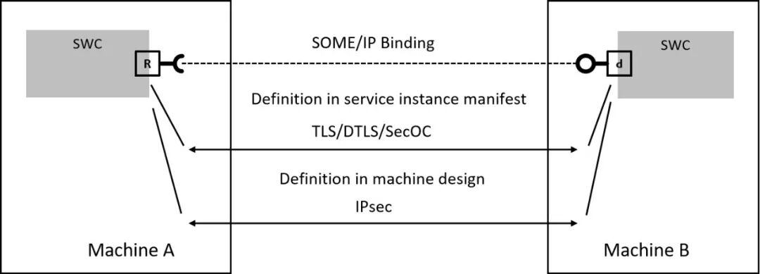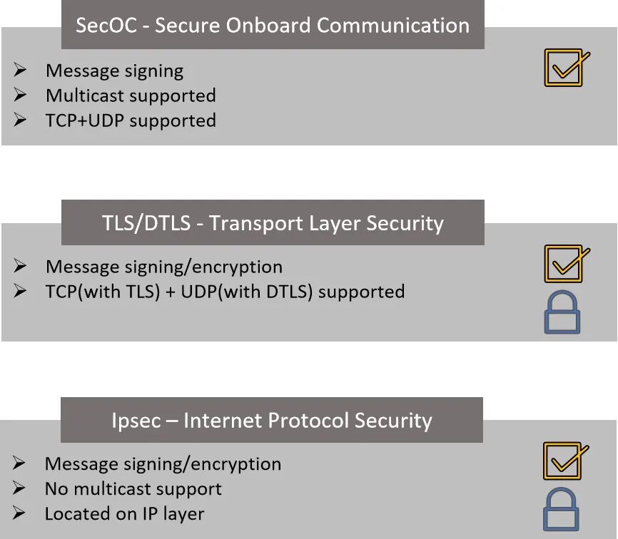 接下来分享一下AP中的安全通信。主要从以下三个方面考虑:1. 完整性,安全通信的目的就是要保证数据的完整性。对于SOME/IP Binding来说,我们 Communication Management可以看到这几种绑定的协议,SecOC它支持Message Signing、多播、TCP/UDP都支持。TLS层面也有相关的一些绑定的支持,IPsec Security在标准里面都是支持的。IPsec-Internet Protocol Security