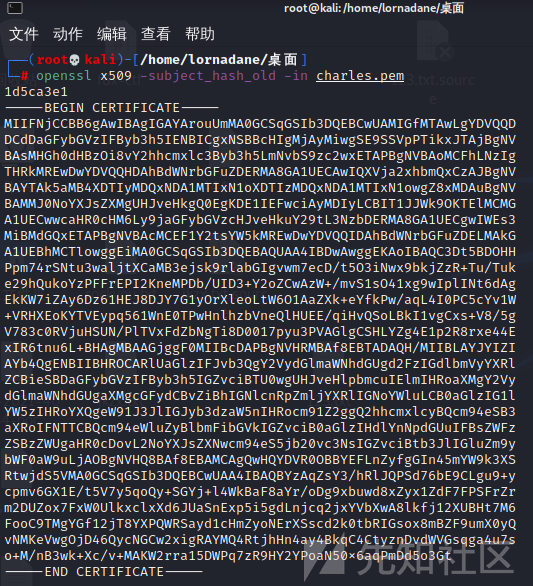 生成一个.pem的证书,但是安卓系统级的证书是.0结尾的,所以需要转换一下,我们通过kali中的openssl来计算出文件名就可以。