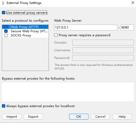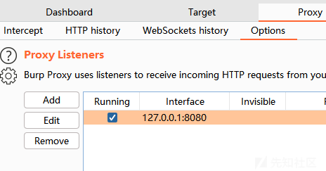 记得两个选项都要配置127.0.0.1:8080,因为我们的burp就是默认监听8080端口的,若不是8080,改成自己burp上监听的端口就可以了。